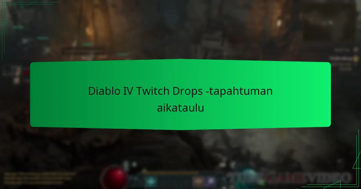 Diablo IV:n Twitch Drops -tapahtuma-aikataulu sisältää sarjan live-lähetyksiä, joissa pelaajat voivat ansaita eksklusiivisia pelin sisäisiä palkintoja katsomalla osallistuvia Twitch-kanavia. Nämä tapahtumat tapahtuvat tyypillisesti useita kertoja vuoden aikana, ja tarkat aloitus- ja lopetuspäivät ilmoitetaan etukäteen.